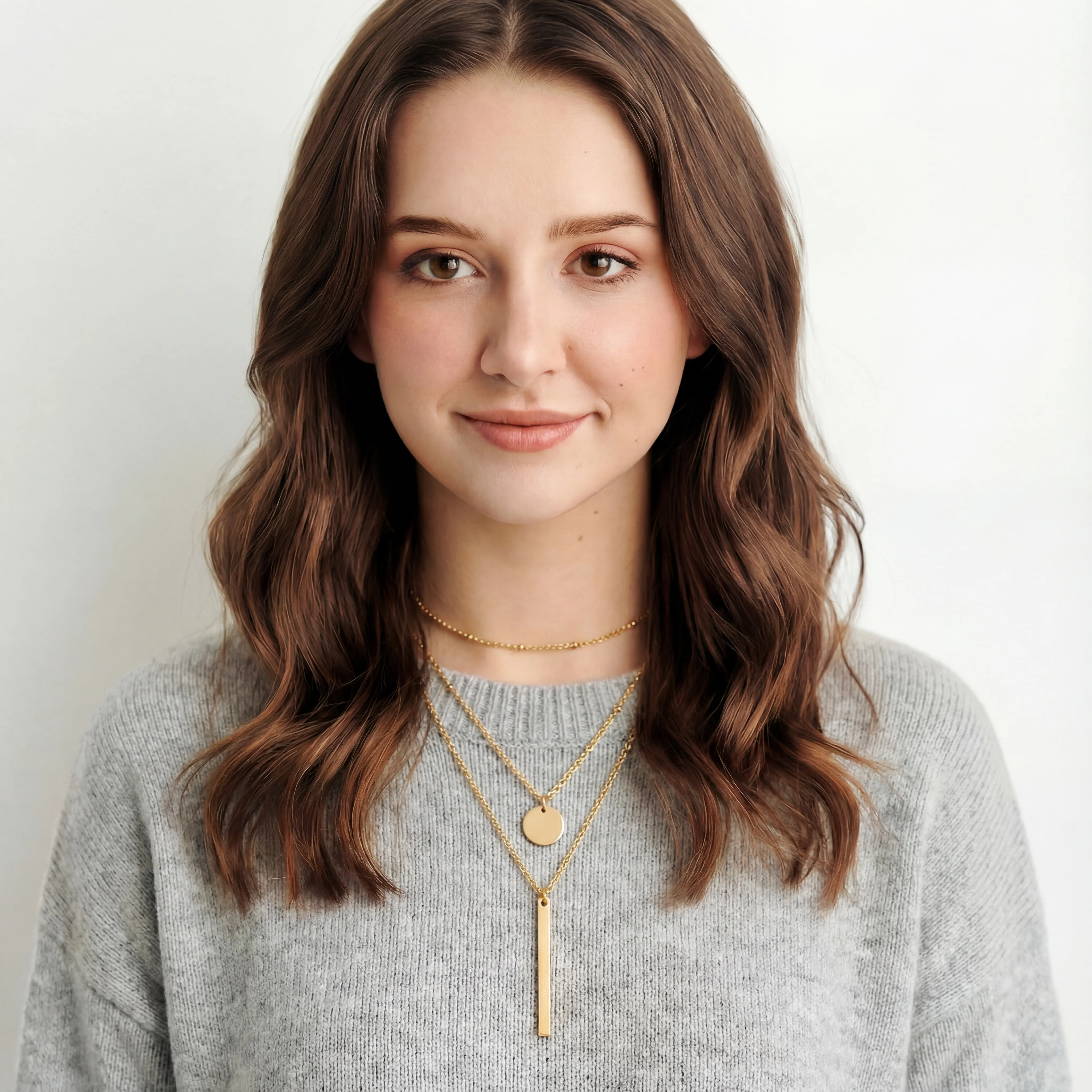 With three lightweight connected chains, the Bar Drop Layered Necklace features classic lines and shapes to add elegance to any outfit. This layered set features a short beaded necklace, a simple disc hung upon a simple chain and a longline bar pendant necklace.