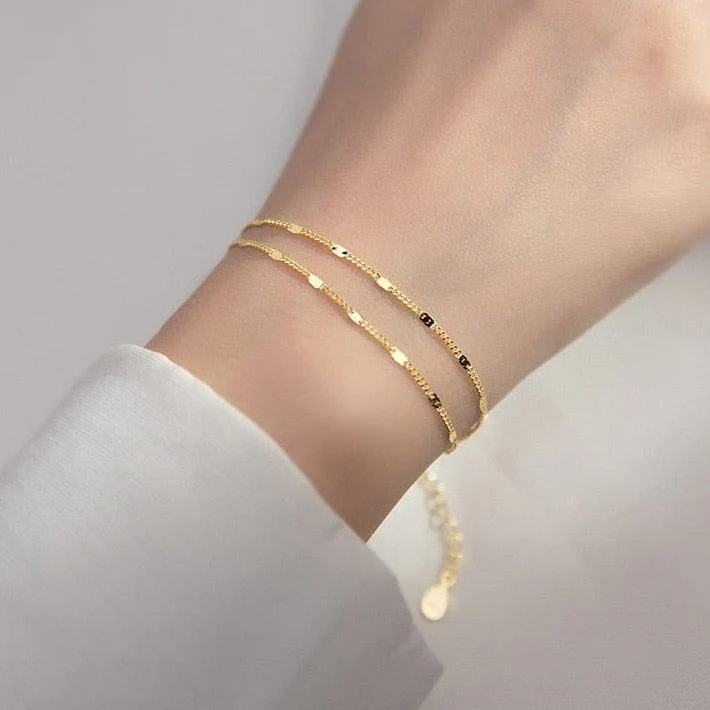 By popular demand, 'The London' Double Bracelet is the perfect match to our much-loved necklace. Elegance redefined, this bracelet features a light chain interspersed by minute flat discs and looks the epitome of luxury on the wrist. Available in both 925 Sterling Silver and 18k Gold Plated Sterling Silver, this piece is sure to be an everyday favourite worn alone or layered with your favourite pieces. Complete the set with 'The London' Delicate Chain.